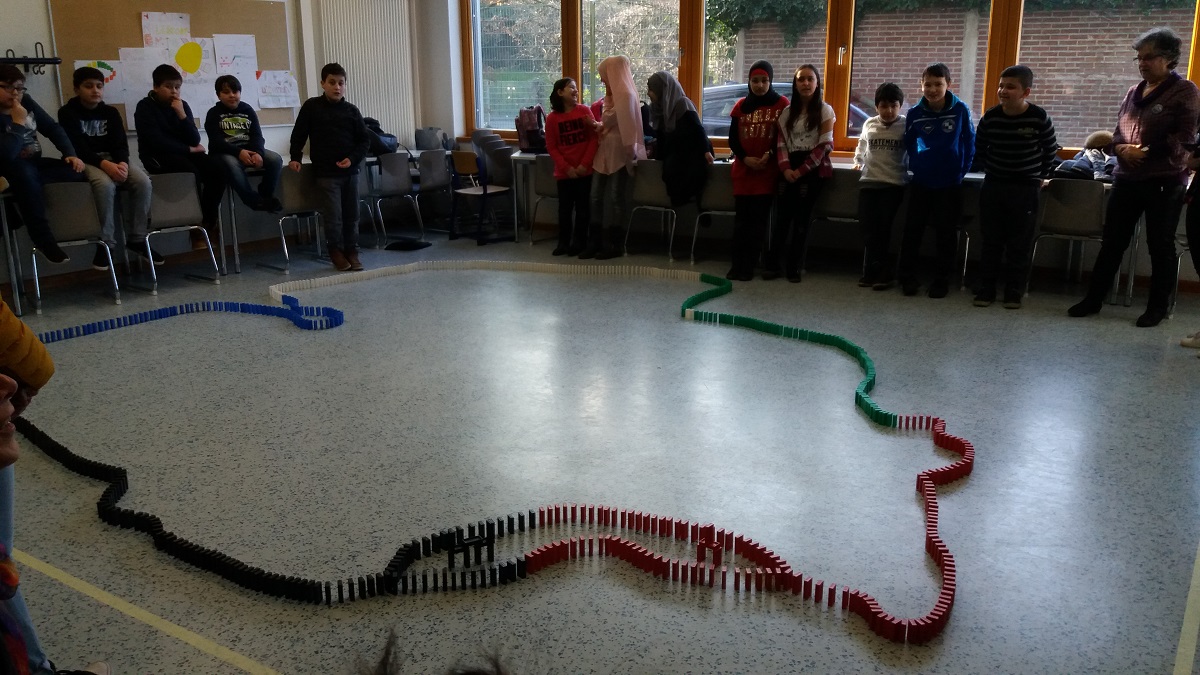 Im Spieleraum konnten alle Schülerinnen und Schüler sowie alle interessierten Gäste eine DOMINO-Schlange bauen, die um 12 Uhr von Frau Zimmerman zum Anstoß gebracht wurde: